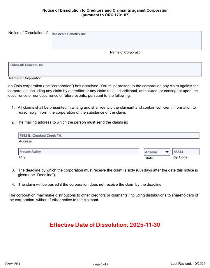 A predecessor corporation, Radiocarb Genetics, Inc., was officially dissolved effective Nov. 30, 2025. (Notice of Corporate Dissolution)